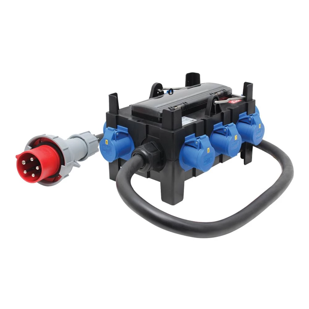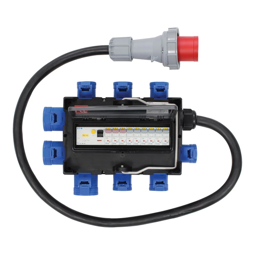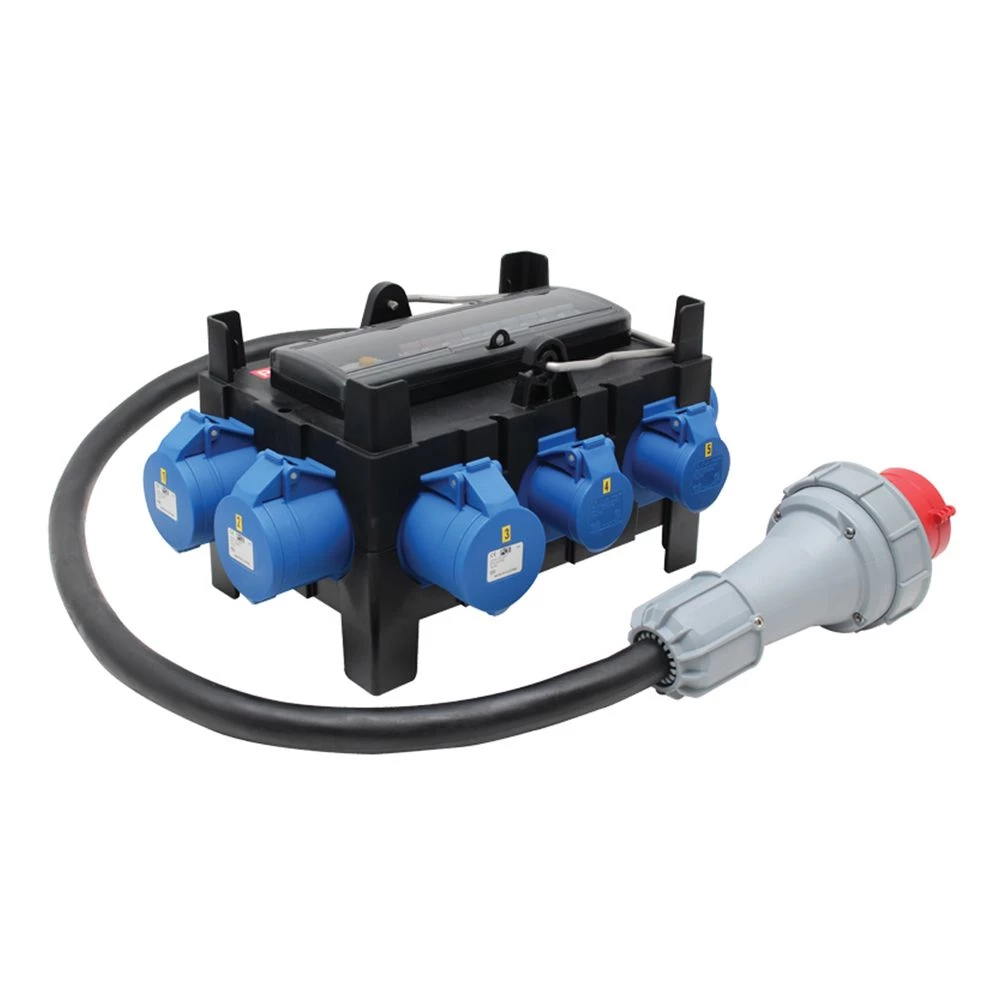 The distribution box’s input consists of a 63A 415V50/60Hz 5-Pin 3P+N+E via a 1.2m trailing cable (with a fitted plug). The outputs consist of three 32A 220-250V50/60Hz 2P+E sockets and six 16A 220-250V~50/60Hz 2P+E sockets, each with protection from a C type MCB. The entire unit is protected by a 30mA 4-pole RCD.